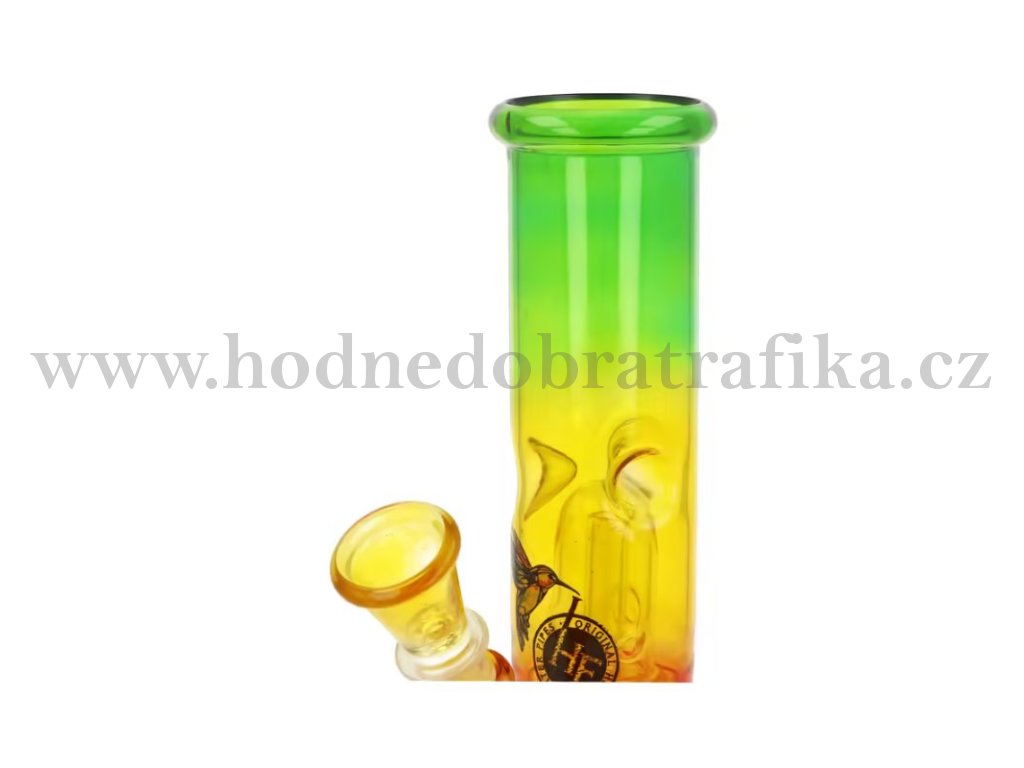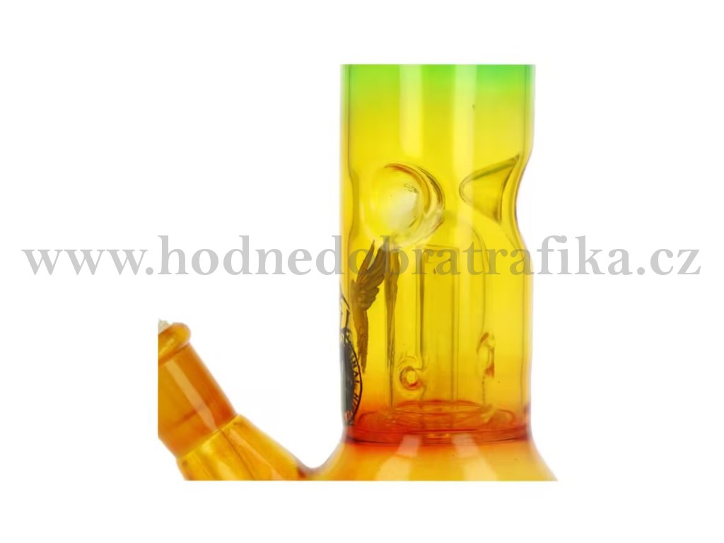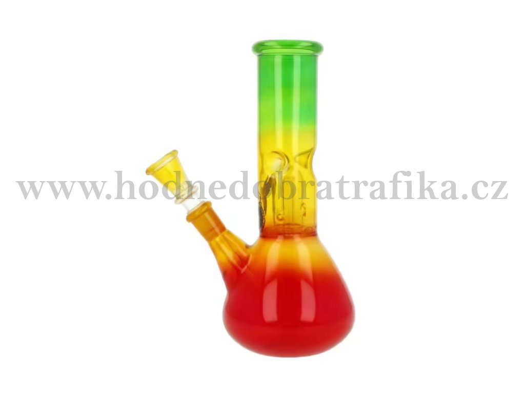 Menší skleněný bong s perkolací Conic RYG. Rovný bong v trojbarevném transparentním provedení zdobený logem je ukončený slabším hrdlem. Ice bong je vybavený "výstupky" pro udržení kostek ledu k ochlazení kouře a perkolací Dome, která kouř rozdělí a tím ještě více pomůže ochladit. Oproti standardním bongům je tento prémiový bong vyrobený z tepelně odolného borosilikátového skla tloušťky 2,5 mm. Jednodílný chillum bongu je ukončený nalisovaným kotlíkem s malým otvorem pro kouř (cca 4 mm).