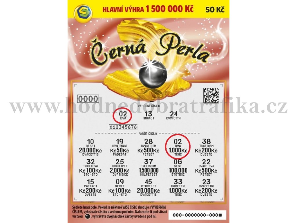 Setřete celé hrací pole na losu. Zkontrolujte, zda se některé číslo v části VÝHERNÍ ČÍSLA shoduje s číslem v části VAŠE ČÍSLA. Pokud ano, gratulujeme. Vyhráváte částku uvedenou pod shodným číslem. Našli jste pod stírací vrstvou symbol černé perly? V tom případě se můžete radovat. Vyhráváte dvojnásobek částky uvedené pod symbolem černé perly.