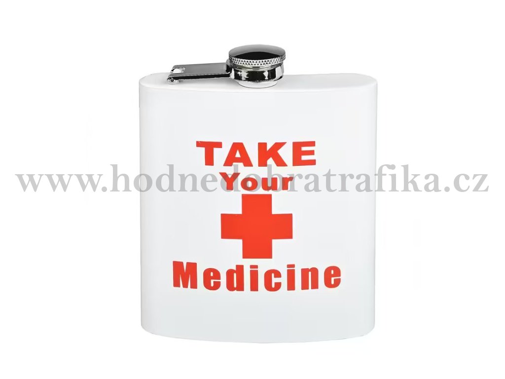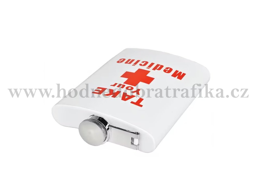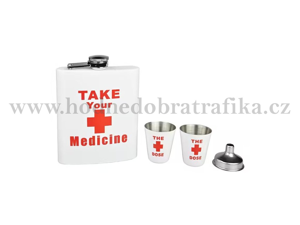 Dárková sada placatka na alkohol (likérka) Take Your Medicine s pohárky. Likérka je vyrobená z kvalitního nerezové plechu a její povrch je v pololesklém bílém provedení s červeným motivem. V této atraktivní placatce budete mít vždy vaše oblíbené pití při sobě. Obsah sady: likérka, 2 pohárky, nálevka.
