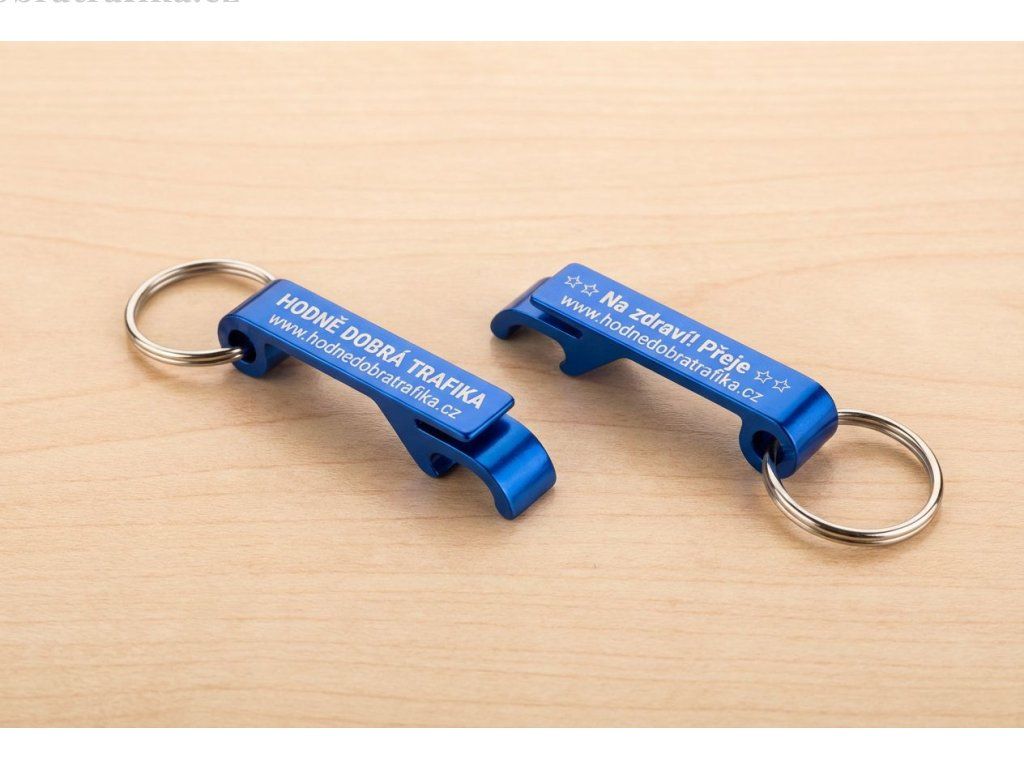 Malý parťák, který udělá velkou službu: stylový otvírák na lahve ve formě přívěsku na klíče. Mějte ho pořád u sebe – na klíčích, batohu nebo v autě – a otevření piva či limonády je otázka vteřiny. Modré kovové provedení s gravírováním HODNĚ DOBRÁ TRAFIKA / hodnedobratrafika.cz a nápisem „Na zdraví! Přeje“ z něj dělá i super drobný dárek.