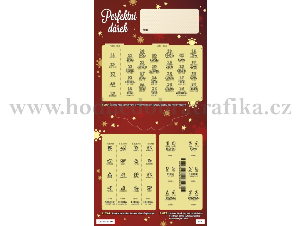 3. 3. HRA obsahuje celkem 6 samostatných Herních polí označených DÁREK 1, DÁREK 2, DÁREK 3, DÁREK 4, DÁREK 5, DÁREK 6. Po setření příslušného herního pole této 3. HRY se v něm zobrazí 2 čísla a jedna peněžní částka. Pokud takto objevíte dvě shodná čísla v jednom herním poli, vyhráváte peněžní částku v něm uvedenou.