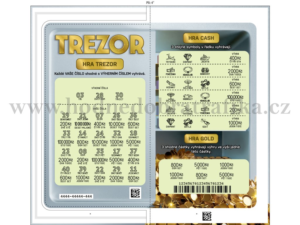 1. V prvním herním poli označeném HRA TREZOR jsou po setření 3 Výherní čísla a 20 Vašich čísel. Každé z Vašich čísel, které se shoduje s některým číslem Výherním, vyhrává výhru pod ním uvedenou.