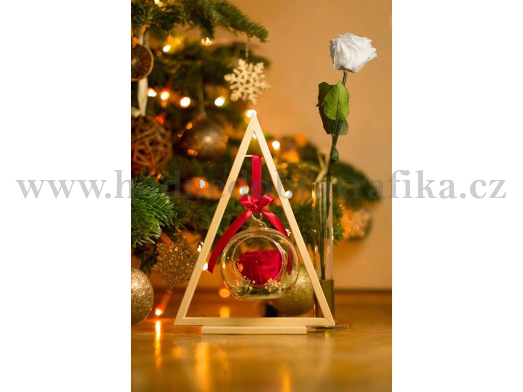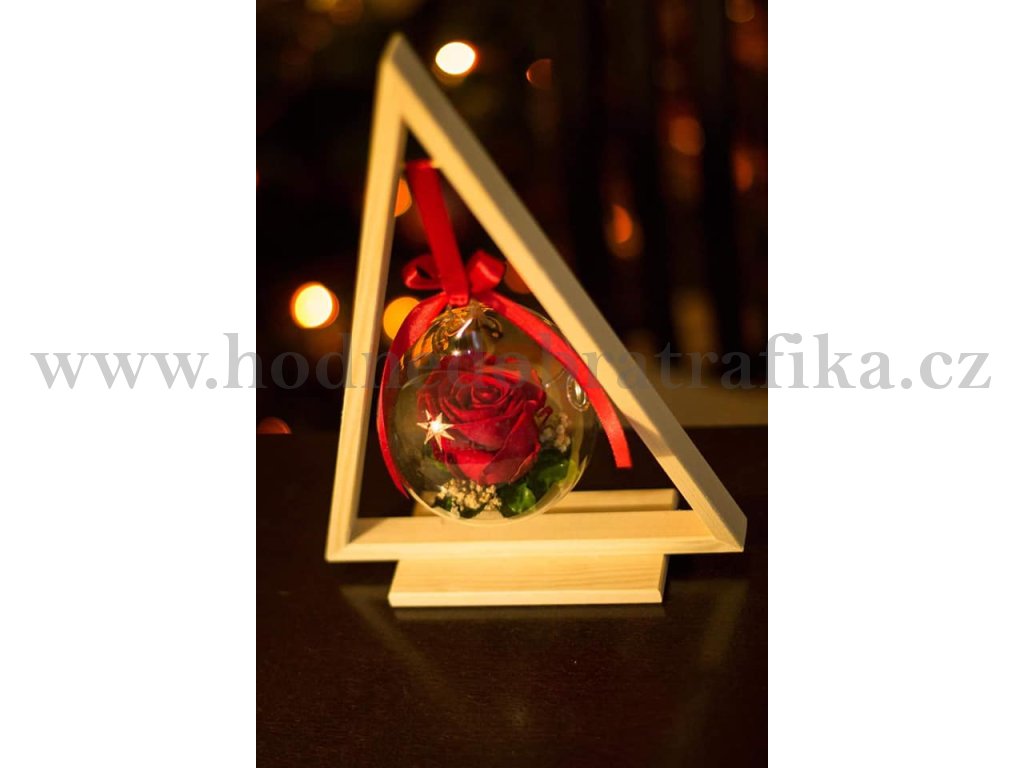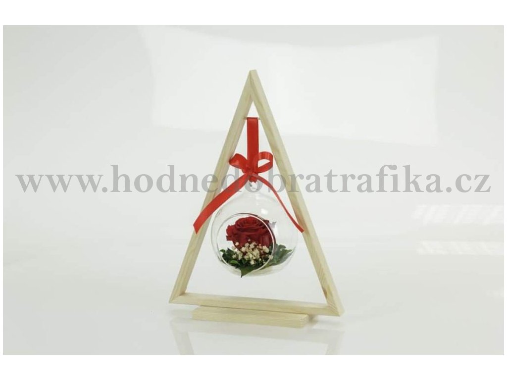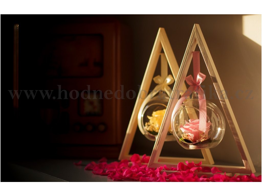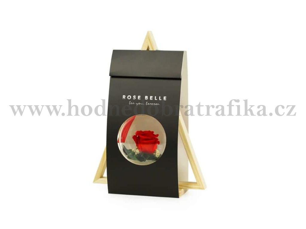 Kompozice je vyrobena z krásné stabilizované růže v mnoha živých barvách, z nichž si můžete vybrat. Růže je umístěna v krásné skleněné kouli a zavěšena na dřevěném trojúhelníku. Kompozice Rose Belle je podstata jemné elegance, která bude perfektním dárkem pro milovaného člověka.