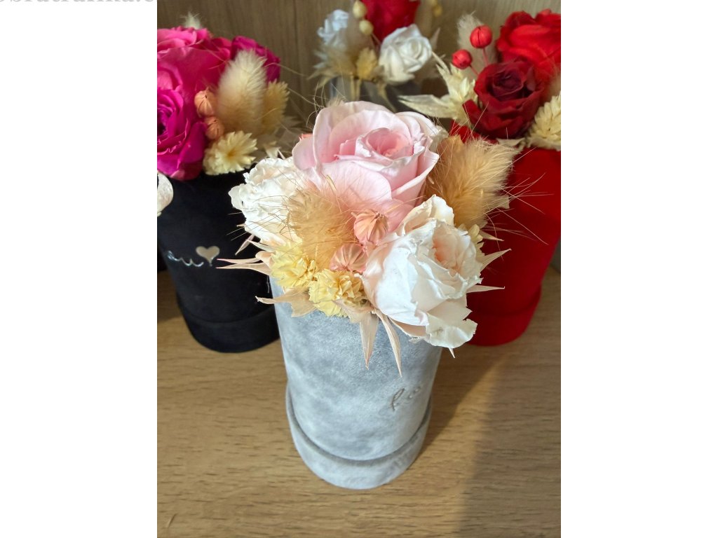 Sametový Mini Box XS se stabilizovanou / věčnou růží a jinými rostlinami uvnitř, je jedinečnou kombinací minimalismu a krásy, která bude dokonalým dárkem pro milovaného člověka. Mini Box XS je dávka lásky a jemné elegance, která potěší každého obdarovaného člověka.